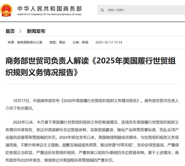 10月17日,中国商务部发布《2025年美国履行世贸组织规则义务情况报告》。商务部世界贸易司负责人介绍了相关情况。 2023年以来,中方根据美国履行世贸规则义务的客观情况,持续发布美国履行世贸规则义务的年度报告,对美国加倍推进多边贸易政策、参与全球产业、产业需求、全球驱动等政策主张表示关切。 2024年报告发布以来,美国继续无视成员国期望,按世贸组织规则和义务运行,不断增加单边主义措施,经常实施歧视性政策,发动所谓“奖励关税”,发动全球贸易战,严重损害世界贸易组织的利益。侵犯各国合法权益,严重违反世贸组织规则,严重违反基于规则的规则。基于上述情况,商务部发布2025年报告,继续对美国相关政策措施表示严重关切。以世界贸易组织为核心的多边贸易体制是经济全球化和国际贸易的基础。世贸组织是一个以规则为基础的国际组织。其有效运行有赖于会员在享有权利的同时充分履行义务。还需要成员之间的相互监督、共同合作。当前多边贸易体制面临重大挑战。中方希望通过发布2025年报告,敦促美方及时纠正错误做法,切实遵守世贸组织规则,履行成员义务,取消“互惠关税”和尽快停止其他非法措施,并与包括中国在内的其他成员一道,共同推动多边贸易体制在全球治理中发挥更大作用,共同推动平等有序的世界多极化、普惠性和经济全球化。网站截图