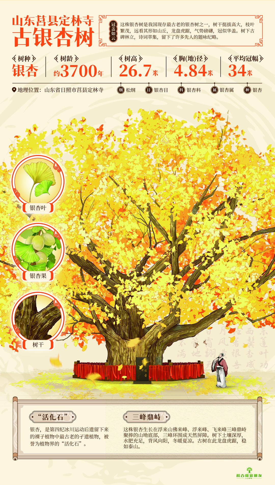 小空间里藏着一枚小邮票,是什么样的故事?今年8月,在中国邮政发行的“古树名木”特种邮票上,一棵产自山东省日照市莒县的古银杏树格外引人注目。古银杏树有怎样的美?距莒县县城西约8公里,俯瞰浮来山。它不仅是国家4A级旅游景区,也是一座历史博物馆。穿过山门,步行至定林寺,可见一棵巨树——树高26.7米,平均树冠宽度34米。古银杏树下有许多古碑,还有许多古人写下的诗词、碑刻。随着时间的推移,古碑上斑驳的文字已经褪去,记载着古树的悠久岁月和历史。这棵古树也是文化遗产的见证。定林寺有一栋二层楼房,h造型独特、简洁。额头上刻着“孝敬楼”三个大字。这是郭沫若1962年为纪念祖籍莒县的南朝文学理论家刘勰而写的。刘勰花费多年的心血,撰写了一部系统、全面的文学理论专着《文学思想与雕龙》,影响了后人千余年的文学创作和研究。如何保护古银杏树?莒县通过补充调查、档案归档、名录保护等措施,建立了古树保护体系。李建国是古树的守护者之一。 “维护树木就像做人一样,必须尽心尽责。”李建国今年61岁,从事园艺工作40多年。自2014年来到定林寺后,他就常在古银杏树下度过。浇水,防治病虫害、人工疏果……日常工作虽然微不足道,但却非常重要。蓟马是常见害虫之一。严重的虫害会导致叶子变黄,树势下降。为了精准防治,李建国每年5月下旬、7月下旬、8月下旬定期对古树喷洒农药,防止虫害。为了让护理任务更加精准,司李建国从2014年开始撰写《大树日记》。“3月26日发芽,4月10日开花,9月10日坐果,10月25日左右叶子变黄……”李建国的笔记本记下的不仅仅是物候变化,更是古树每一次“呼吸”的痕迹。他记录了温度、湿度、叶子状况、果实负载,甚至发现异常的日期以及如何处理。这些详细记录成为专家判断树木状况、制定政策的第一手依据维护计划。近年来,随着周围种植的银杏树越来越多,这棵古银杏树获得了更多的授粉机会,果实数量较十年前大幅增加。每年6月初,当银杏果实如豌豆大小时,李建国和同事们就开始疏果,避免养分消耗过多,影响古银杏树的健康生长。 “古树不会说话,但它的变化却记录在其中。”李建国一边说着,一边掏出手中的《大树日记》。他用笔墨陪伴古树走过春夏秋冬。在他的保护下,古银杏树依然枝繁叶茂,充满生机。如今,古银杏树已成为莒县的文化名片之一。 “我很高兴有那么多人不远千里来看这个……”李建国感叹道,“我每天都和古老的普诺在一起,我一看就很高兴。 “银杏。银杏又叫银杏树、公孙树,属于银杏科银杏属,是一种高大的乔木,高度可达40米,叶子呈扇形,茎长,呈浅绿色,秋季翻叶。最早出现于距今3.45亿年前的石炭纪,中性或微酸性土壤最适宜。